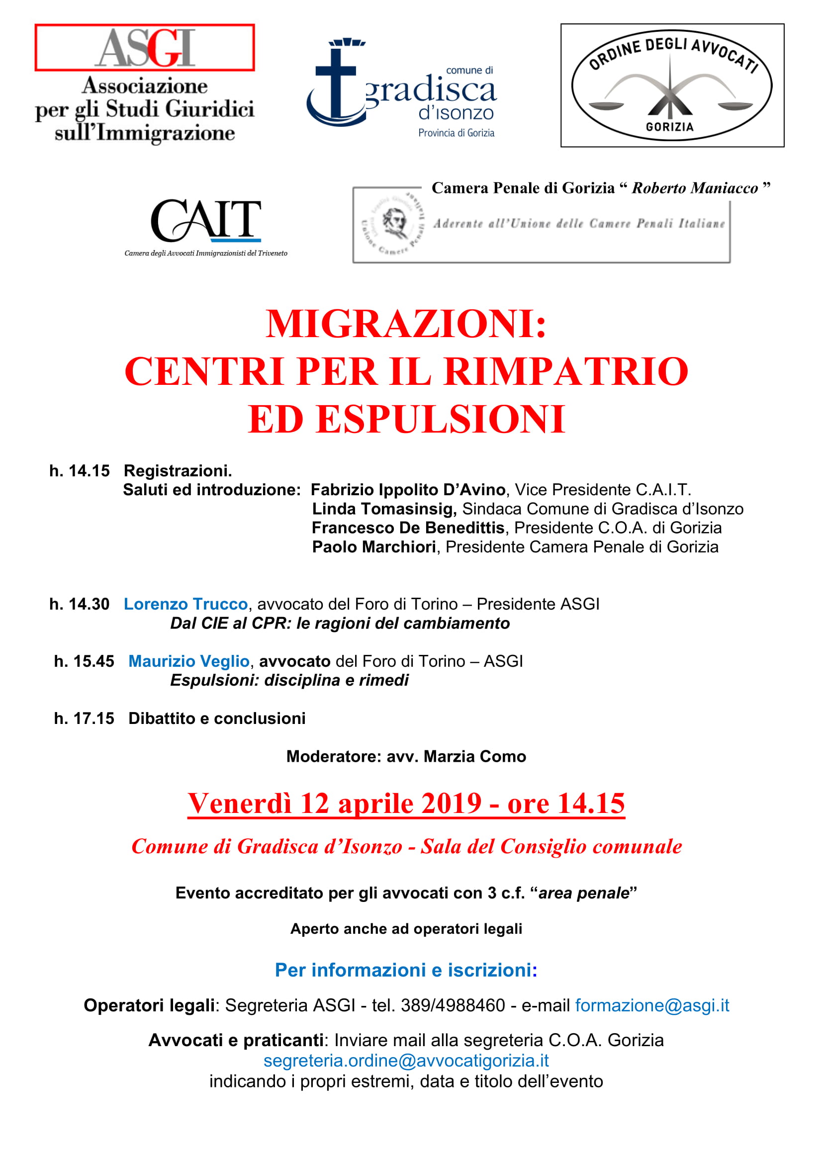 ASGI, Camera degli Avvocati Immigrazionisti per il Triveneto (CAIT), Camera Penale di Gorizia, con il patrocinio del Consiglio dell’Ordine degli Avvocati di Gorizia, propongono un seminario di aggiornamento che, attraverso l’analisi degli istituti giuridici, consenta al giudice, all’avvocato e all’operatore legale, di individuare gli strumenti giuridici necessari a governare il fenomeno, ponendo particolare attenzione ai rimedi posti a tutela dei diritti dei migranti.