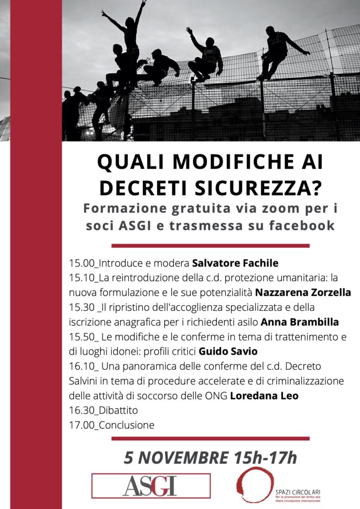 Come sono cambiati i “Decreti sicurezza”? La protezione umanitaria e l’iscrizione anagrafica sono state ripristinate? Questi alcuni degli argomenti che verranno discusse il 5 novembre 2020 dalle 15 alle 17 durante la formazione sulle modifiche ai decreti sicurezza di ASGI e Spazi Circolari in diretta facebook.