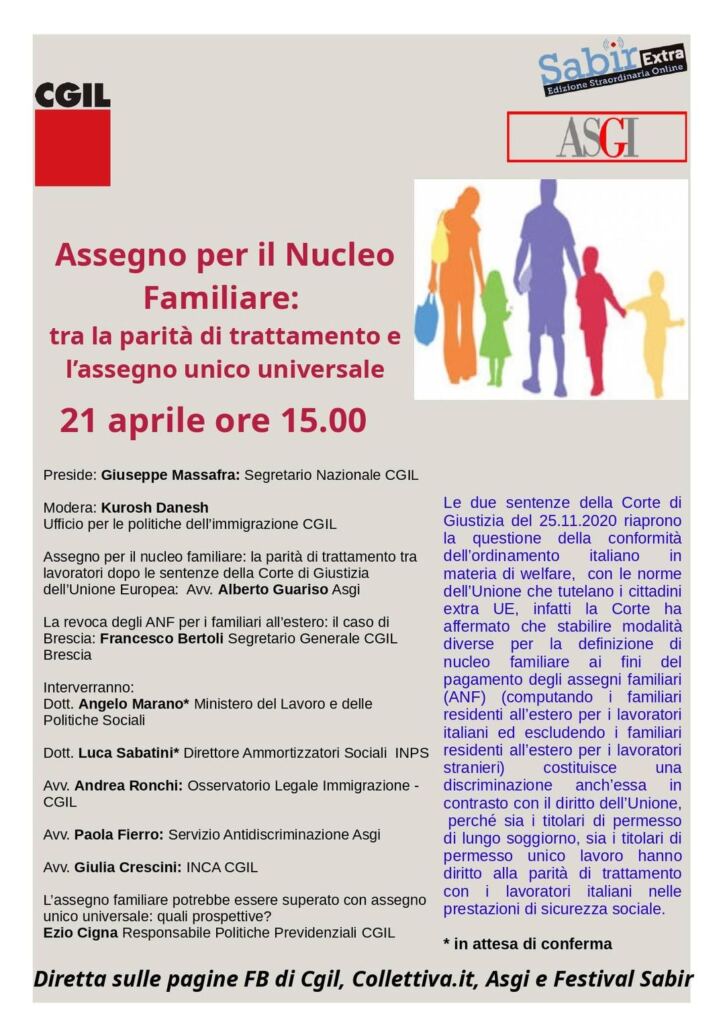 Nell’ambito delle iniziative del Festival Sabir Extra mercoledì 21 aprile 2021 dalle ore 15.00 si terrà il convegno “Assegno per il Nucleo Familiare: tra la parità di trattamento e l’assegno unico universale” , promosso dall’ Associazione per gli Studi Giuridici sull’Immigrazione e CGIL.
