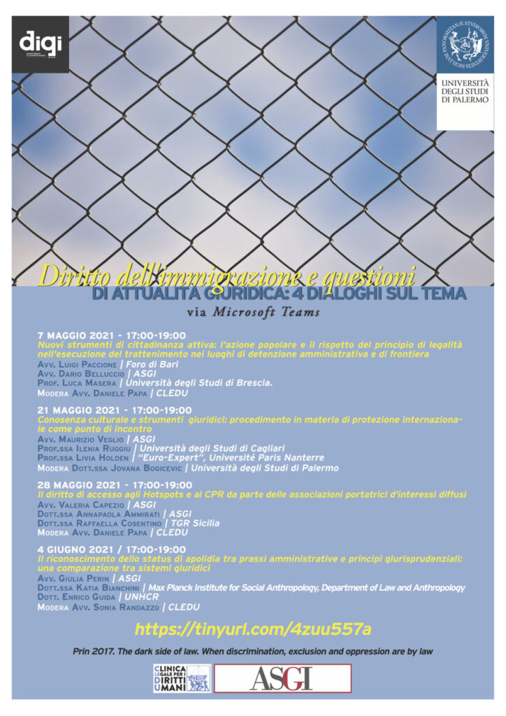 Quattro incontri online promossi dalla Clinica Legale per i Diritti Umani, dal Dipartimento di Giurisprudenza dell’Università degli Studi di Palermo in collaborazione con ASGI.