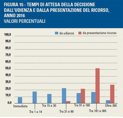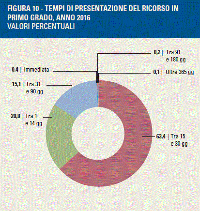 Considerando come punto di partenza la presentazione del ricorso in primo grado, tutti i tempi di attesa si concentrano nelle classi più elevate : il 21,5% tra 91 e 180 giorni, il 52,1% tra 181 e 365 giorni e il 27,6% oltre i 365 giorni.