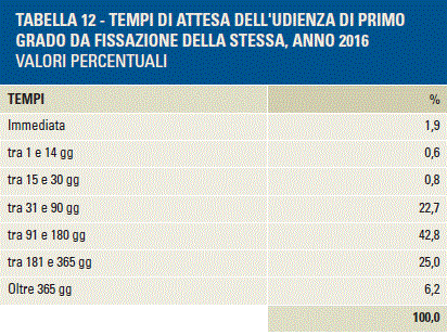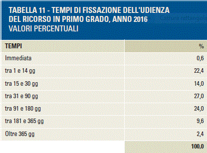 in media 138,1 giorni ovvero circa 4,6 mesi per lo svolgimento della stessa, attesa che sale a 172,4 giorni o 5,7 mesi dalla presentazione del ricorso (influenzato dall’organizzazione del Tribunale).