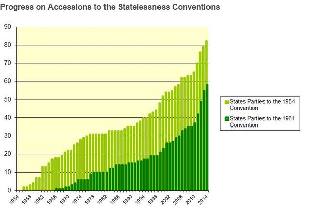 Il grafico mostra la continua crescita dell’adesione degli Stati alle Convenzioni sull’Apolidia (Fonte UNHCR)