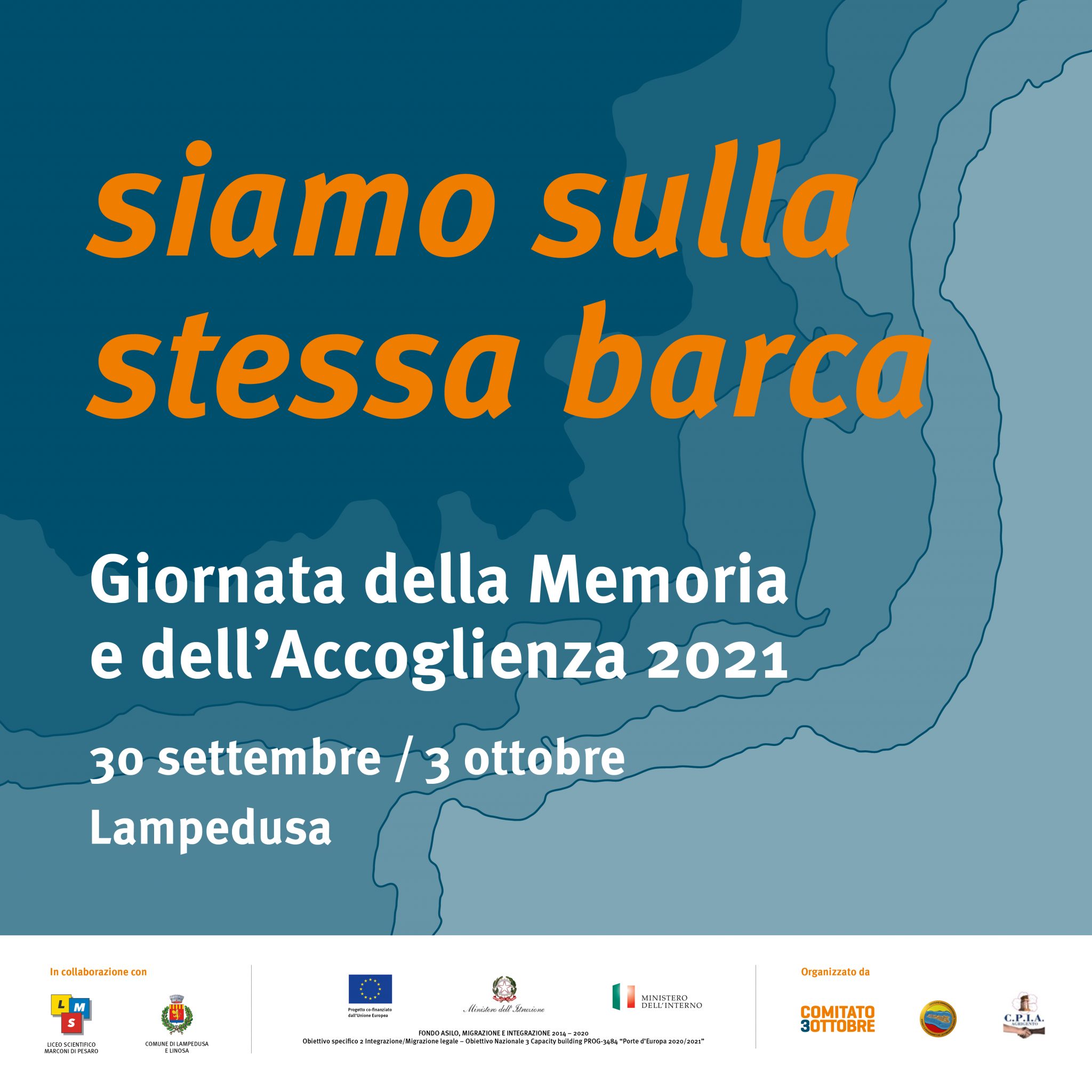 Il progetto Siamo sulla stessa barca organizzato a Lampedusa dal Comitato 3 ottobre è il più grande evento europeo sul tema del fenomeno migratorio rivolto agli studenti italiani ed europei. Si terrà dal 30 settembre al 3 ottobre 2021. Perché il 3 ottobre? Per onorare le 368 persone morte nel tragico naufragio al largo di Lampedusa avvenuto il 3 ottobre 2013 e per ricordare le oltre 22.000 persone che da allora hanno perso la vita nel tentativo disperato di trovare sicurezza e protezione in Europa. Il 3 ottobre è dal 2016, grazie alla proposta del Comitato 3 Ottobre, la giornata della memoria e dell’accoglienza, volta a creare una memoria e una cultura dell’informazione. L’iniziativa è stata insignita della Medaglia della Presidenza della Repubblica italiana e gode dell’Alto Patronato del Parlamento europeo. Chi coinvolgerà? Parteciperanno 60 scuole, 350 studenti accompagnati da 93 docenti di 20 paesi europei (Italia, Bosnia, Croazia, Lettonia, Austria, Ungheria, Portogallo, Grecia, Romania, Spagna, Slovacchia, Germania, Belgio, Slovenia, Francia, Danimarca, Olanda, Inghilterra, Cipro, Estonia). Inoltre l’evento vedrà coinvolte oltre 15 associazioni e organizzazioni non governative italiane ed internazionali, 3 agenzie delle Nazioni Unite. Sull’Isola saranno presenti fotografi di fama internazionale come Isabella Balena e Alessandro Penso. Autorità civili e religiose: l’Arcivescovo di Agrigento Mons. Alessandro Damiano e l’Imam di Catania, Kheit Abdelhafid. Le serate vedranno coinvolti in uno spettacolo inedito gli studenti del Liceo Scientifico, Musicale e Coreutico Marconi di Pesaro, ma sarà possibile assistere anche a un reading inedito di Gianmarco Saurino e Daniele ...